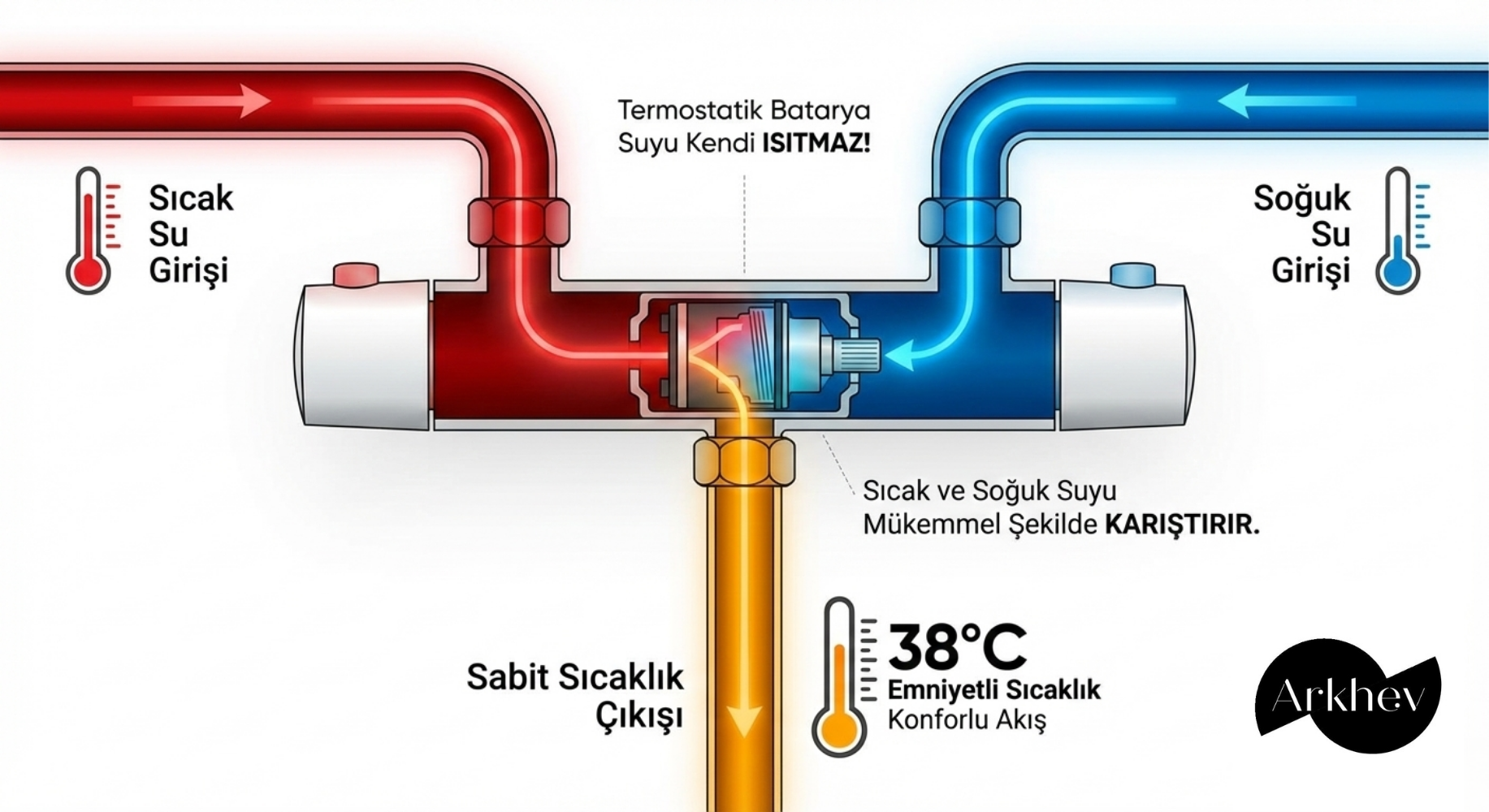 Arkhev Tavsiyesi: Termostatik bataryanızın ömrünü korumak için, tesisat girişinde mutlaka daha önce bahsettiğimiz filtreli ara musluk veya ana girişte bir filtre sistemi kullanmalısınız. Hassas termostatik kartuşlar, suyun içindeki tortulardan korunmalıdır.