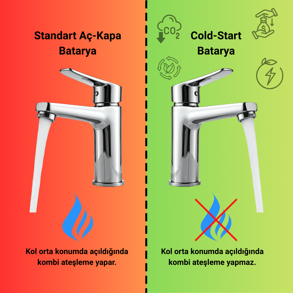 Geleneksel aç-kapa bataryaların çoğunda, kumanda kolu orta konumdayken su açıldığında batarya hem sıcak hem de soğuk suyu karıştırarak verir. Çoğu zaman sadece elimizi yıkamak veya bir bardak su doldurmak için musluğu açtığımızda, sıcak suya ihtiyacımız olmasa bile kombi veya şofben ateşlenir.