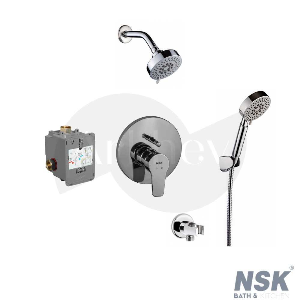Bu set; NSK ankastre banyo bataryası, SMARTBOX sıva altı grubu, 5 fonksiyonlu tepe duşu, mafsallı duş dirseği ve 5 fonksiyonlu el duşu uyumunu tek pakette sunarak modern banyo projelerinde estetik ve konforu bir araya getirir.