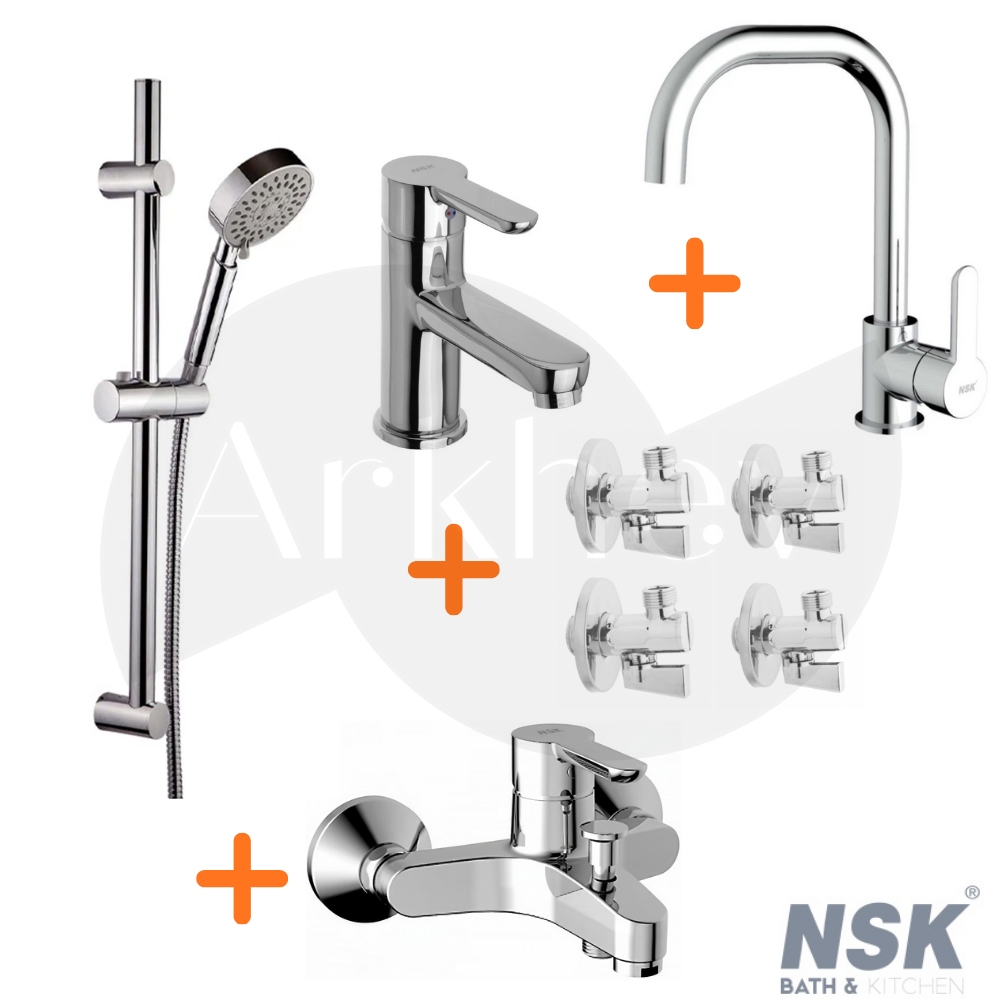 NSK ARKHEV0031, ayrı ayrı parça seçme zahmetini ortadan kaldıran pratik bir settir. Pakette armatür grubundan bir NSK batarya (lavabo, eviye veya banyo tiplerinden stok/konfigürasyona göre), bataryayı korumak için 1/2″ filtreli ara musluklar ve duş alanını tamamlayan sürgülü duş takımı birlikte sunulur.