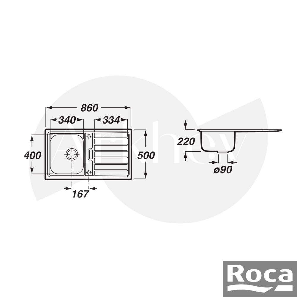 860 x 500 mm ölçü • Tek gözlü lavabo haznesi • Sağ / sol damlalık yönü değiştirilebilir • Tezgâh üstü montaj • Paslanmaz çelik gövde • 5 Yıl Roca Türkiye Garantisi